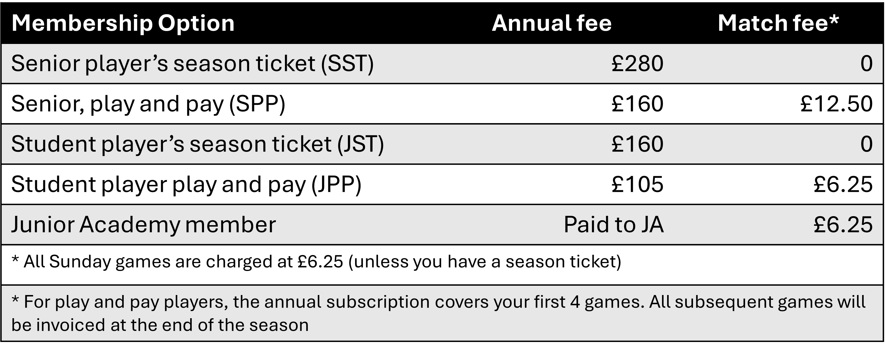 If you are still in full time education (and under 24) but NOT registered to the junior academy, you need to register on the link below and select one of the 'student player' options.The options and costs are below.